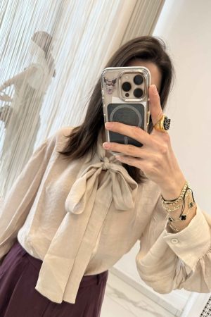 • Şal Yaka Bağlamalı Balon Kol Bluz Bej